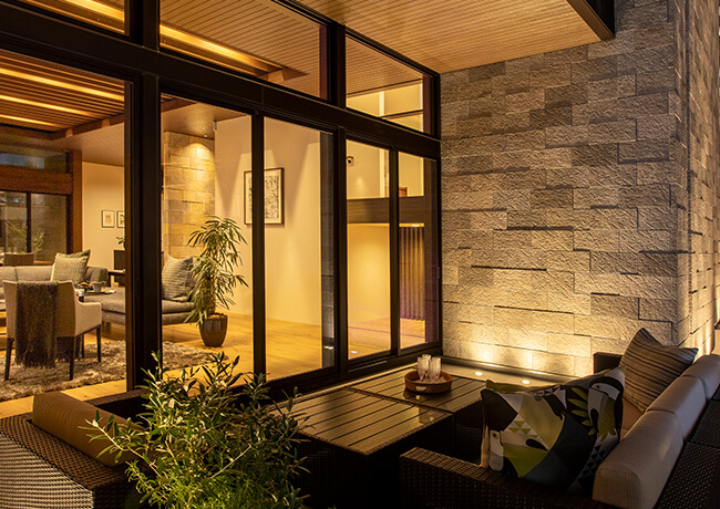 太陽の光の当たり方や位置の変化で、印象的で映える壁面に仕上がることはもちろん、夜、ライティングと組み合わせることも効果的です。